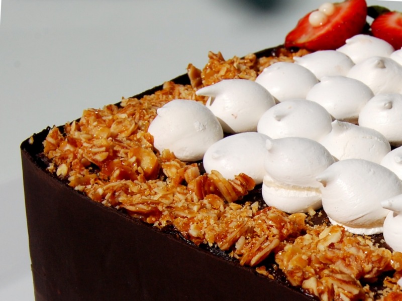 Badem ve fındık mereng plakaları arası bir kat bademli kek, krem patiseri, ganaş çikolata ve vişne.