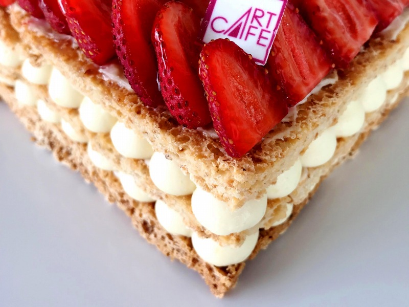 İncecik 3 kat badem mereng plakaları arasında krem patiseri ve üzeri sıvama çilek.